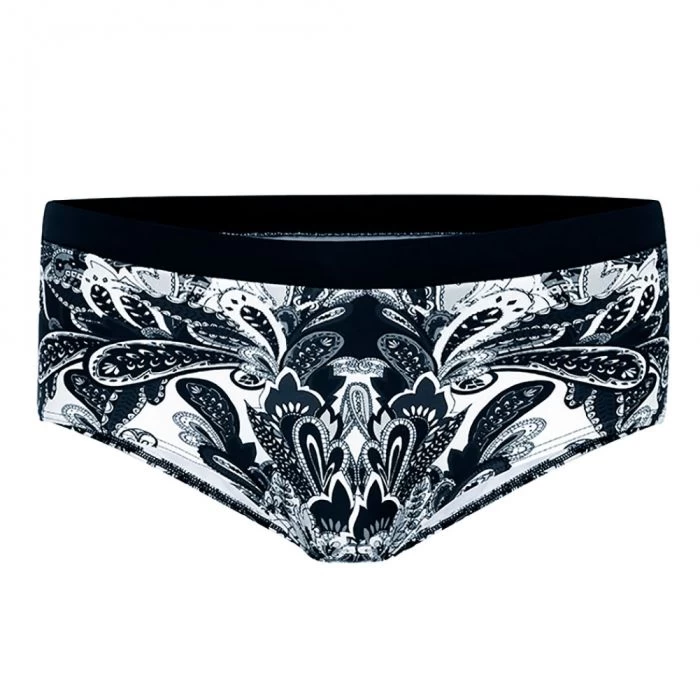 The form fitting swim trunk offers an internal draw cord, elastic waistband and leg opening for a comfortable fit