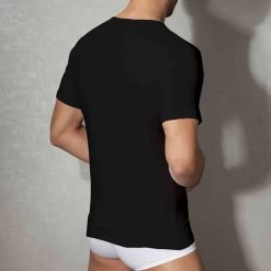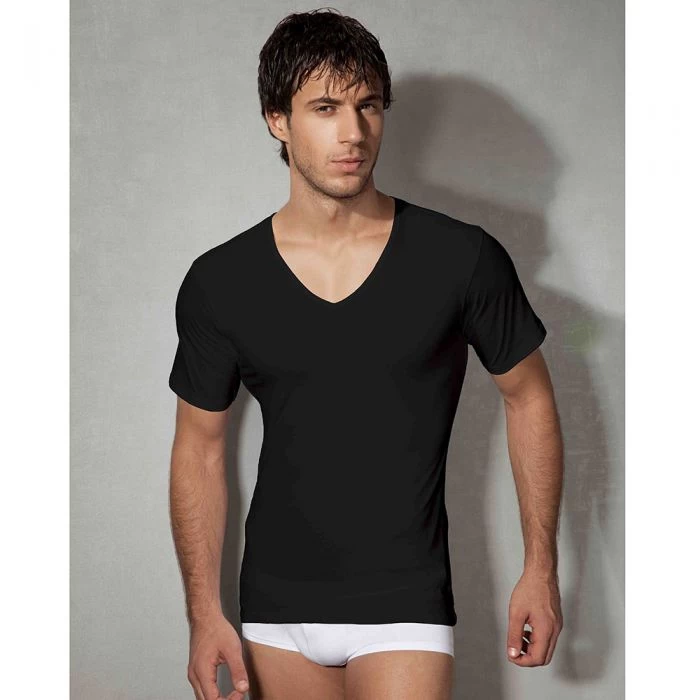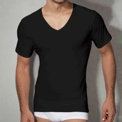 - The v-neck shows just the right amount of chest and is trimmed neatly.