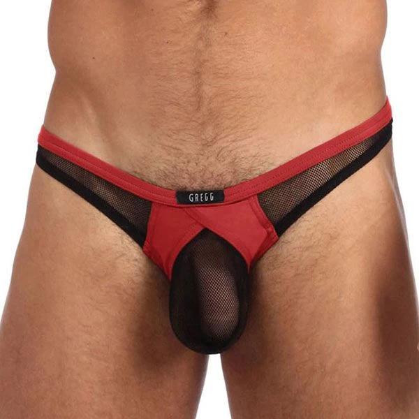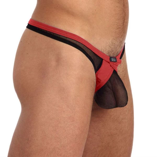 - Black transparent pouch mesh peeking out from two fabric panels parting at the center.