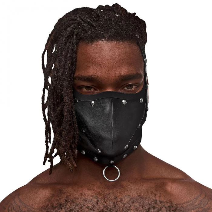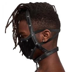 - Stretchy jet black four-way stretch leather look fabric adorned with decorative studs.
