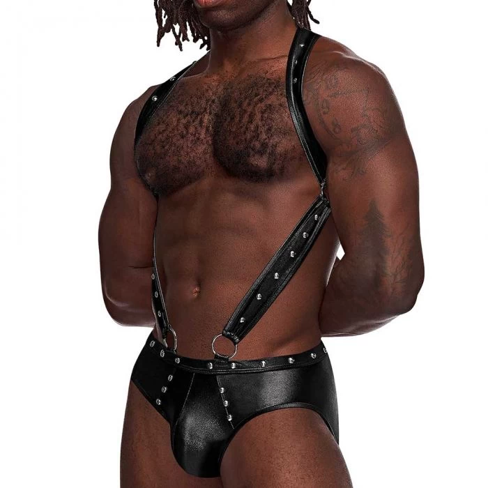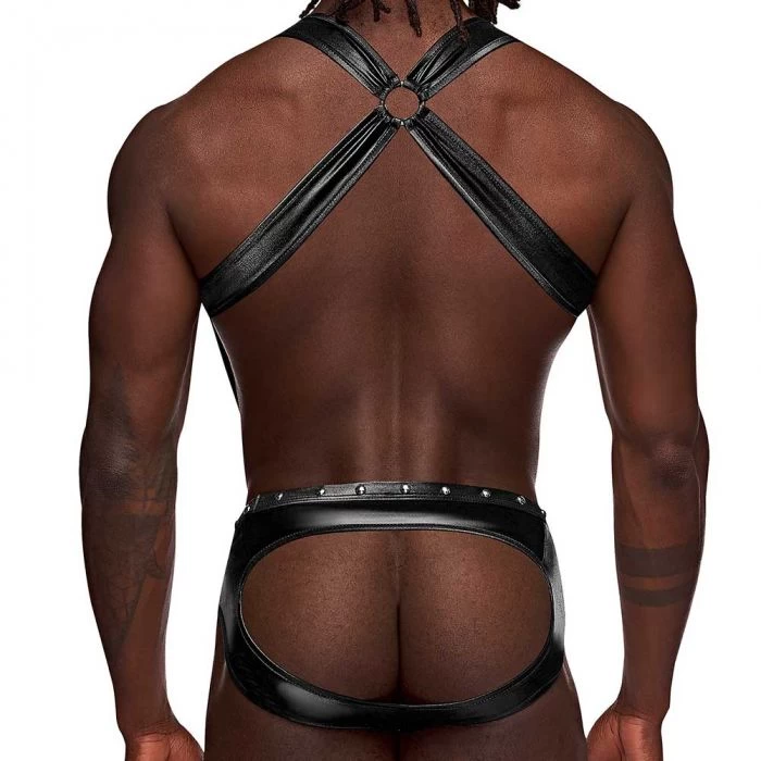 - Suspender straps, harness style back, cutout rear, and attached metal rings and decorative studs.
