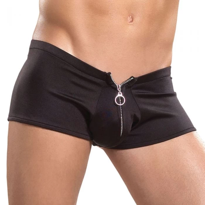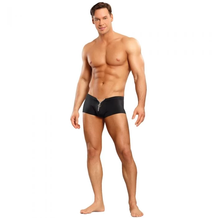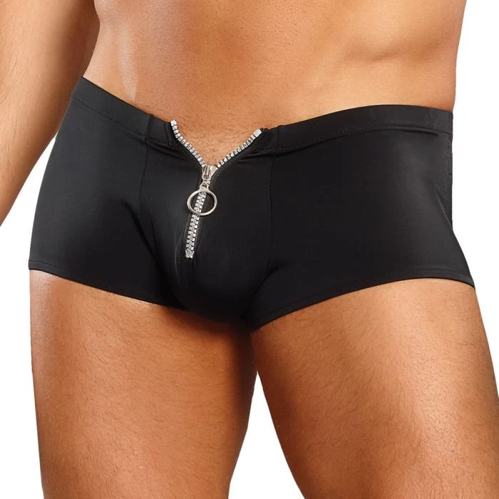 The Male Power stretch mini short features a comfort fit pouch, functional zipper in front with decorative oval slider and plush elastic waistband and trim.