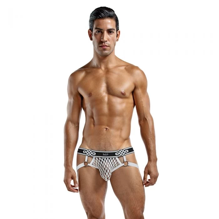 - Ring Jock with plush elastic leg bands attached to decorative metal rings.