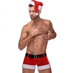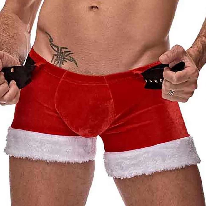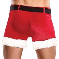 - St. nick-belt and snowy plush trim on the legs and a Santa hat.