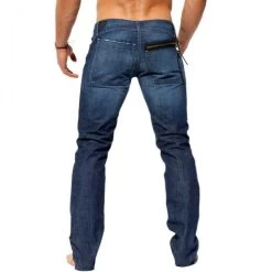 - Bone stitch, antique ram head rivet, button fly, and black leatherette patch back left.
