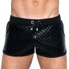 - Thick waistband hugs the hips, geared with branded hardware and leatherette patch.