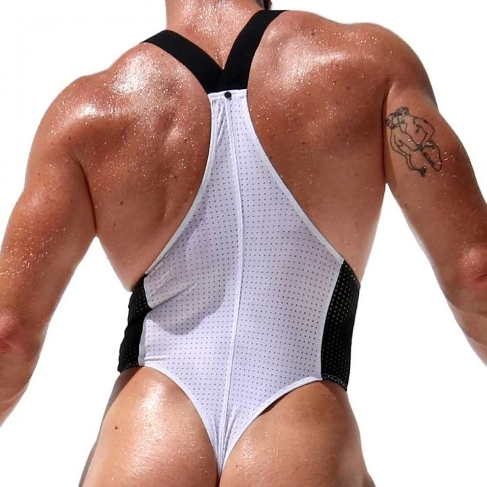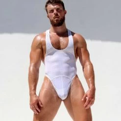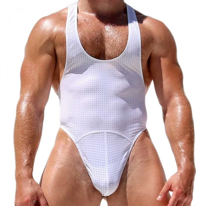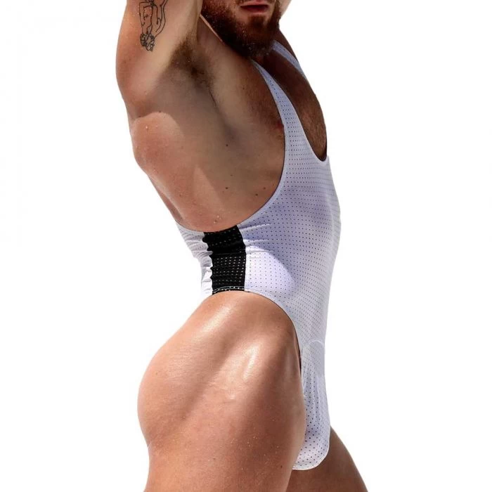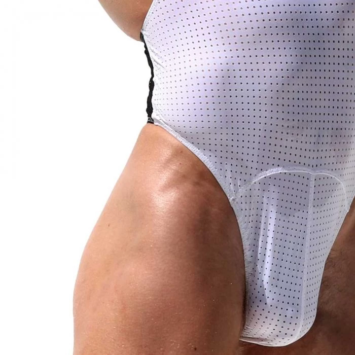 - Thong bodysuit made from optic white, perforated stretch nylon mesh.