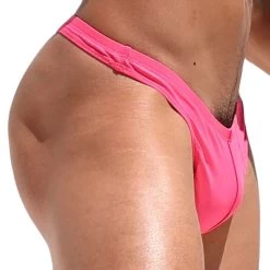 - T-Back/Thong swimwear brief made from matte finish stretch nylon with a bright bubble gum hue.