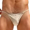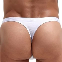 - T-Back/Thong swimwear brief made from shiny finish stretch nylon in optic white.