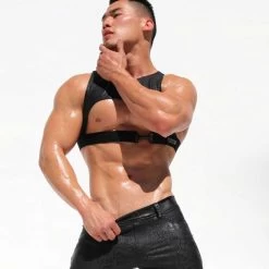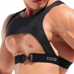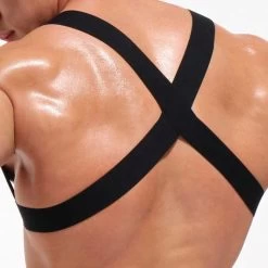 - Stretch harness built with a “rubberized” chest yoke that amplifies the pecs.